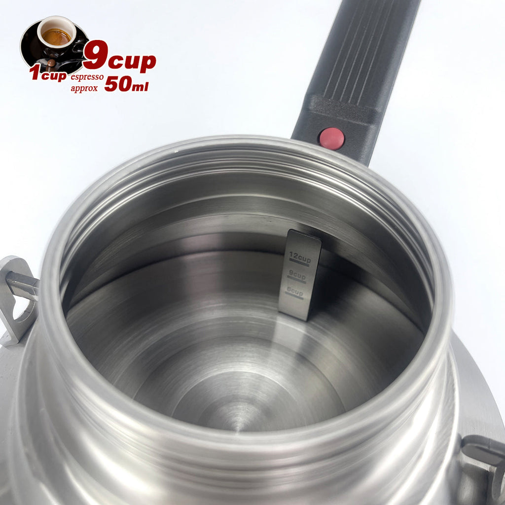 Large Capacity - Suitable for family use - Camping 2-in-1 Mocha coffee maker has a large capacity and can brew 9 cups(about 450 ml ) of authentic espresso at one time. As a kettle, it can brew 12 cups of water(about 600 ml ) at one time.