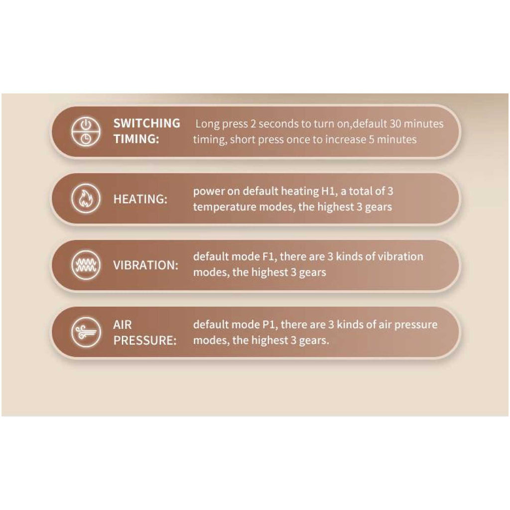 - Airbag Pressure and High-Frequency Vibration: Benefit from the triple threat of 3-gear airbag pressure, 3-gear high-frequency vibration, and 3-gear temperature heating compression. This triple-action approach ensures a comprehensive and effective kneading massage experience.