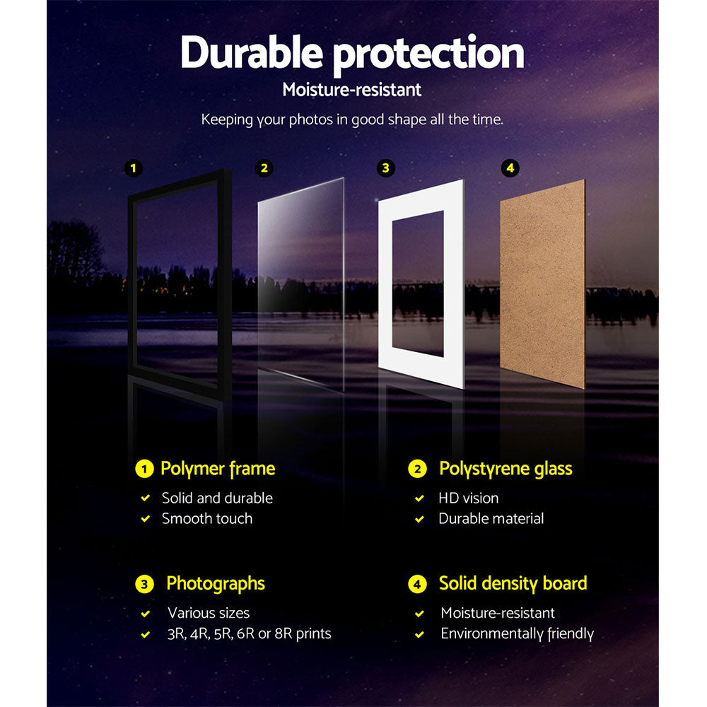 Every picture tells a story. And we are sure your extensive photo collection has lots to tell. So why not frame up the interesting ones on the wall and share the stories behind them to friends and family. You can do that beautifully with our charming Photo Frame Set. Available in a set of 3, our set allows your walls to be graced with fascinating stories and memorable moments from your treasured photographs. Arrange them in any way you like. Portrait or landscape, the framed photo feature wall is a conversational piece in its own right. Suitable for A3 photograph size, the frames feature a durable polymer construction with a polystyrene glass to keep your prints in good shape. The hardboard backing is also moisture-resistant. Hanging accessories are also included with your