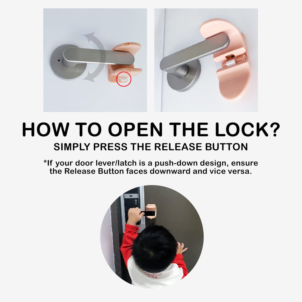 You can unlock the locking device by pressing the release button. If your door lever/latch is a push-down design, ensure to install the item with a release button facing downwards and vice versa.