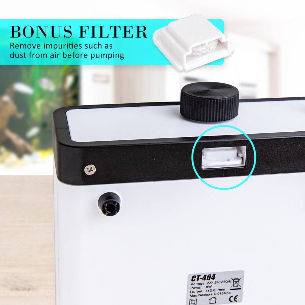 Dynamic Power Aquarium Air Pump Oxygen Hydroponic 4 Outlet 670L/H 8W - White