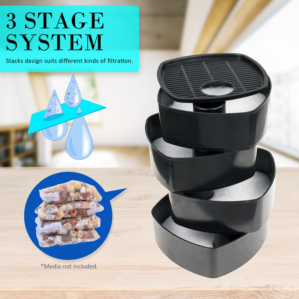 The amazing multi-level filter is capable of offering you the best filtration system as it can hold large quantities of mechanical, biological and chemical filtering materials! The 4 filtration baskets comes with handy handles and allow you to make many different filtering combinations, hence, they give you more flexibility and control over the quality of the water of your tank. The ideal filtering materials are sponge, ceramic noodles, bio balls and carbon.