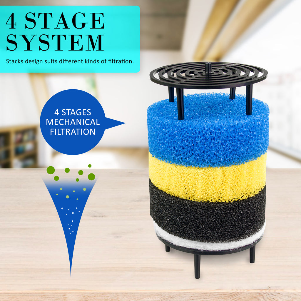 The amazing multi-level filter is capable of offering you the best filtration system as it can hold large quantities of mechanical, biological and chemical filtering materials! The 4 filter sponge given for easy setup. The ideal filtering materials are sponge, ceramic noodles, bio balls and carbon.