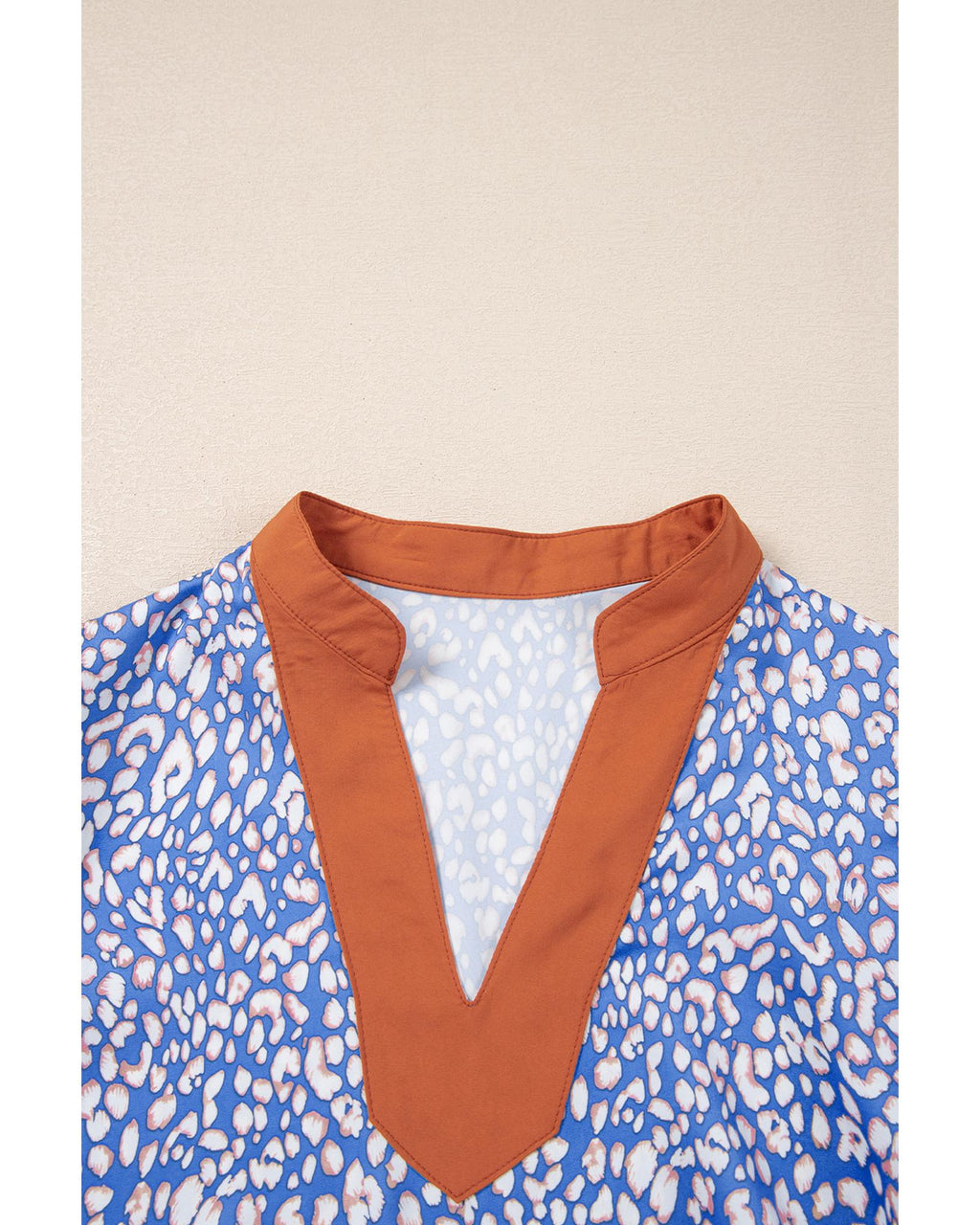 - Ashleigh Blue Leopard Print Spot Contrast V Neck Half Puff Sleeve Shirt
