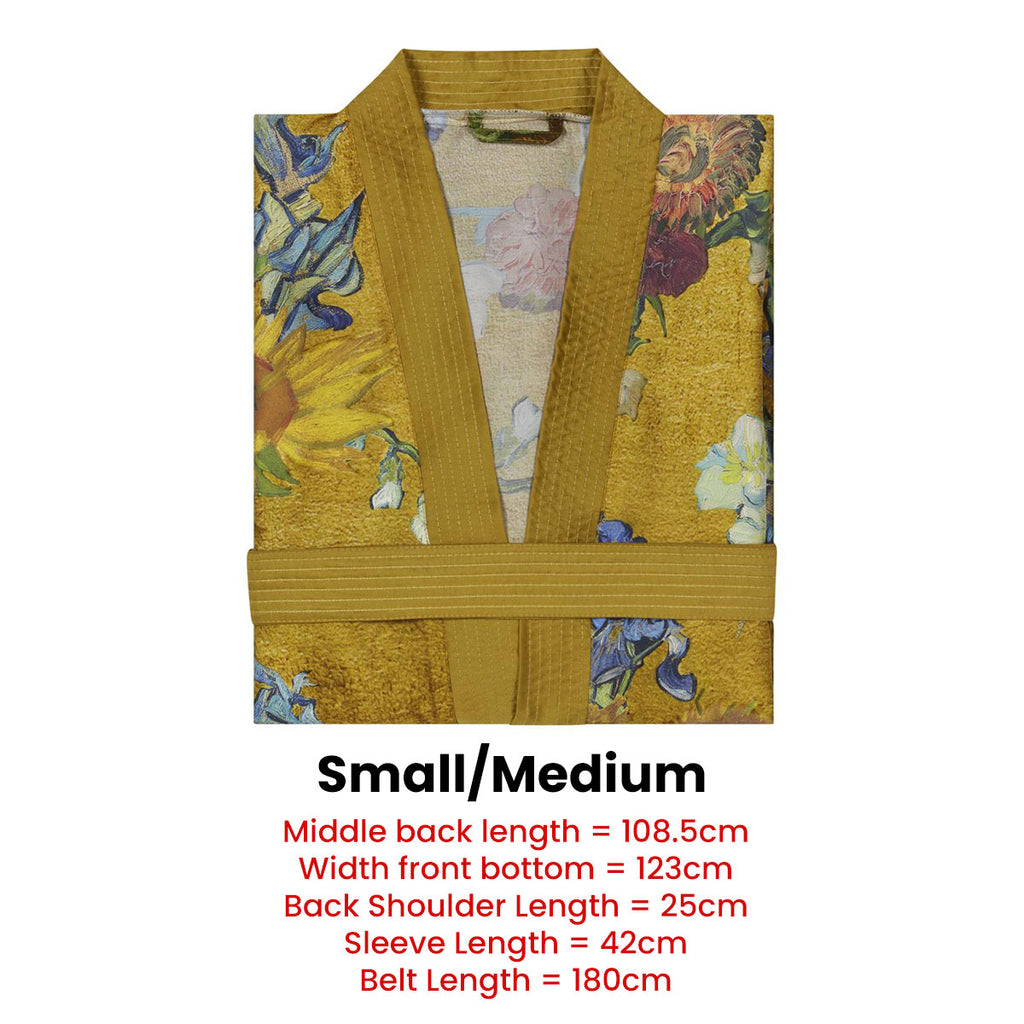 The Van Gogh Partout des Fleurs Gold Kimono Bath Robe by Bedding House echoes the Bouquet d'Anniversaire. This bouquet is a treat from the Van Gogh Museum, and therefore from Vincent himself, in honour of the museum's 50th anniversary. This golden jubilee will be celebrated with a beautiful bouquet of cut flowers hailing from various flower paintings in the museum's own collection. For example, you can find flowers from the paintings: Irises, Small Bottle with Peonies and Blue Delphinium, Vase with Chinese Asters and Gladioli, Sunflowers and, of course, the classic Almond Blossoms in orange, yellow, white, green, red, brown, blue, purple, pink, and grey colour tones. These cut flowers are on a golden background, and this design looks gorgeous on the kimono. This is a unique design for a unique moment in the history of Van Gogh and the Van Gogh Museum. This kimono is the height of opulence.