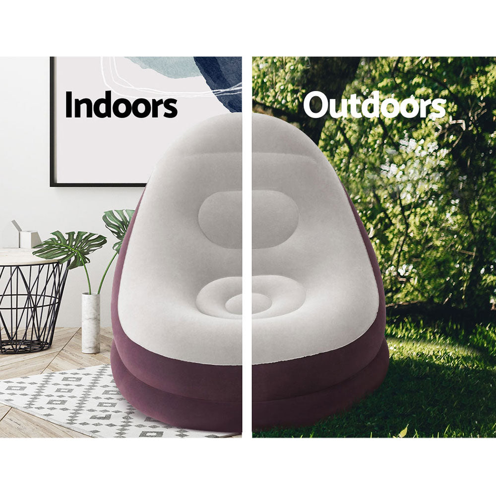 Kick back and chill out with our inflatable Bestway Air Chair. The set comprises a seat and a separate footrest to give you complete total-body relaxation. Easy to inflate and deflate with two air chambers, you can use it as convenient lightweight furniture in your home, carry it out to the garden to soak in the sun, or take with you for camping or road trips so that you can feel at home wherever you are. The sturdy coil-beam construction and the tall seat backrest provide you with just the right amount of support and cushioning for ultimate comfort. Better still, the surface is made from soft-textured flocked material that feels wonderful on your skin yet is easy to clean and maintain. The air chair is made to last, but should an accidental tear occur, our supplied repair kit should be adequate to patch your comfort back with minimum fuss.
