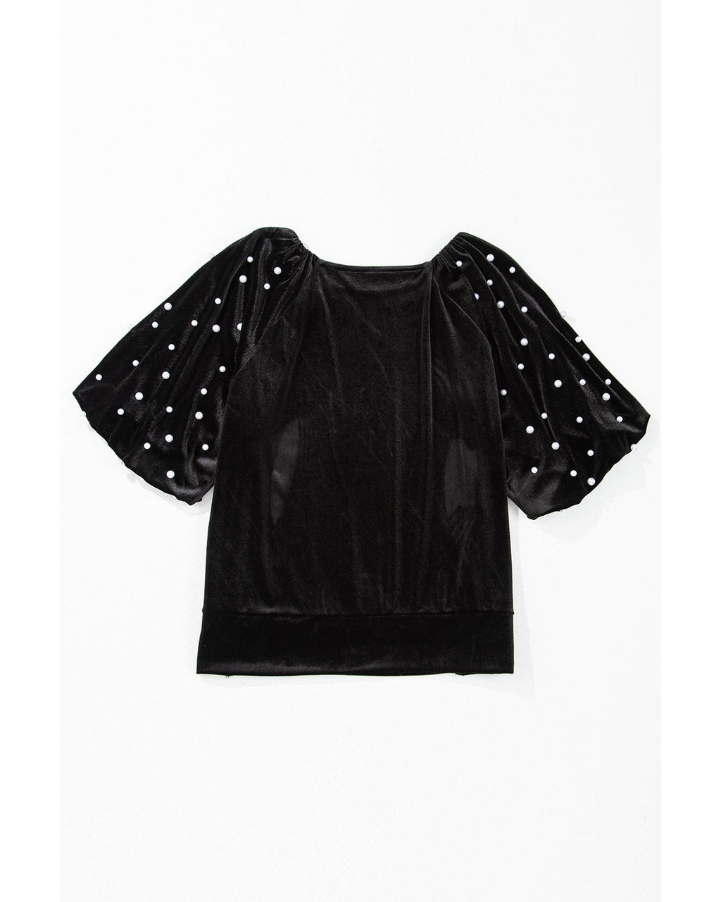 Black Pearl Beaded Half Sleeve Velvet Top - XL