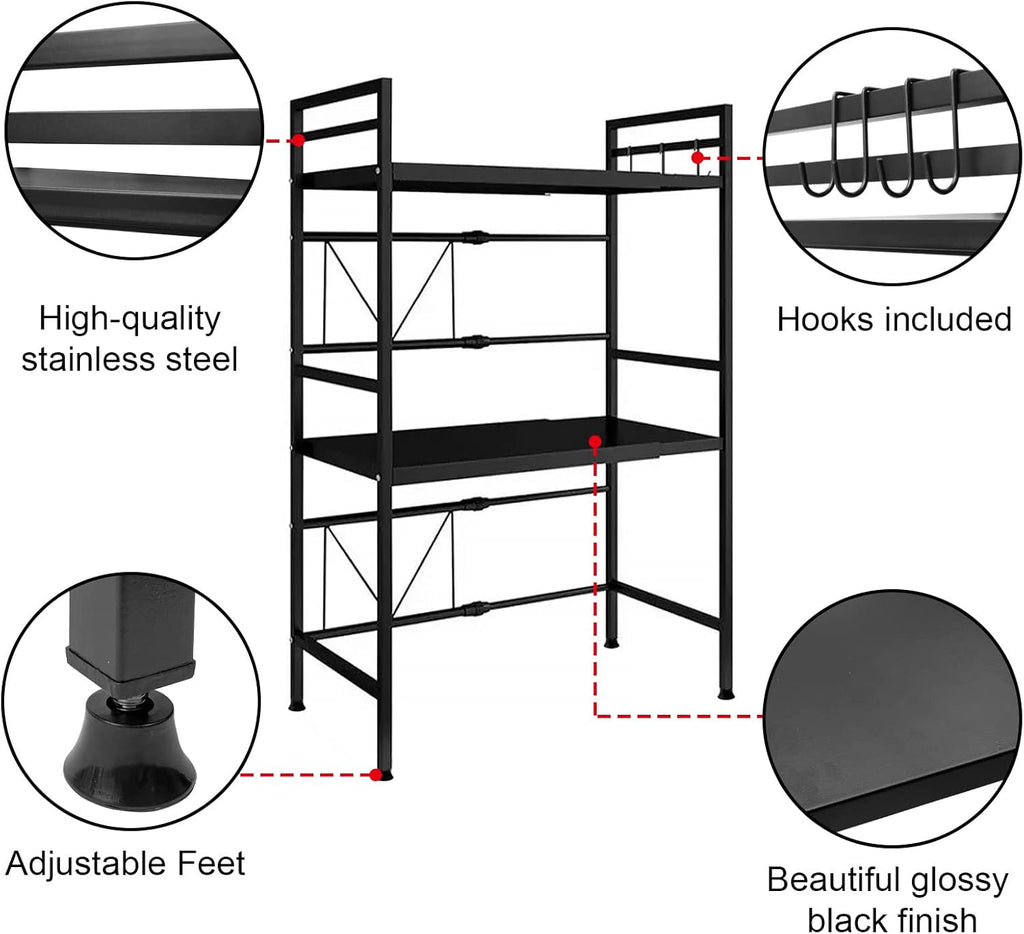 CARLA HOME 3-Tier Microwave Oven Rack with Adjustable Metal Kitchen Shelf Stand for Countertop Storage and 6 Hooks for Utensils