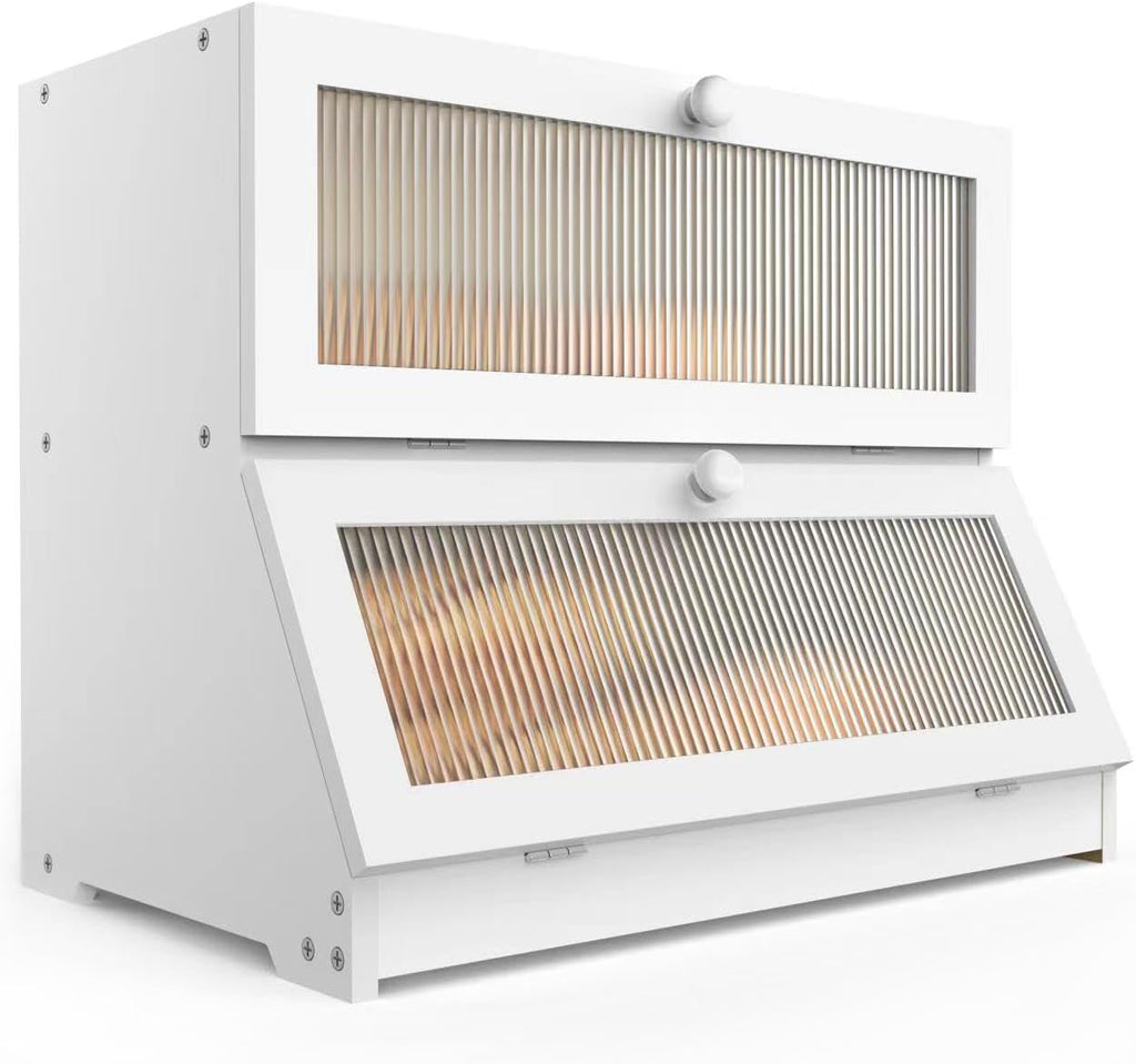 CARLA HOME Double Layer Bamboo Bread Box for Kitchen Counter - Large Capacity Bread Storage Container with Clear Window, Easy Assembly, Farmhouse Style Bread Holder (White)