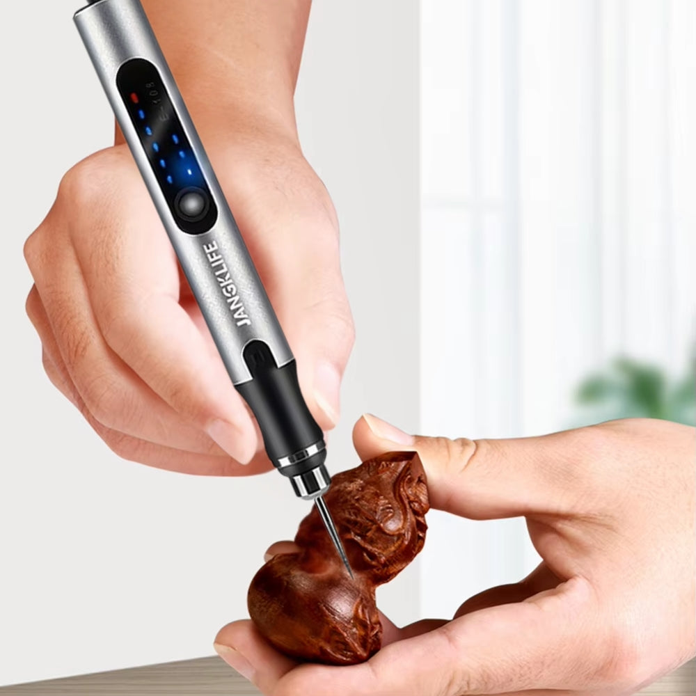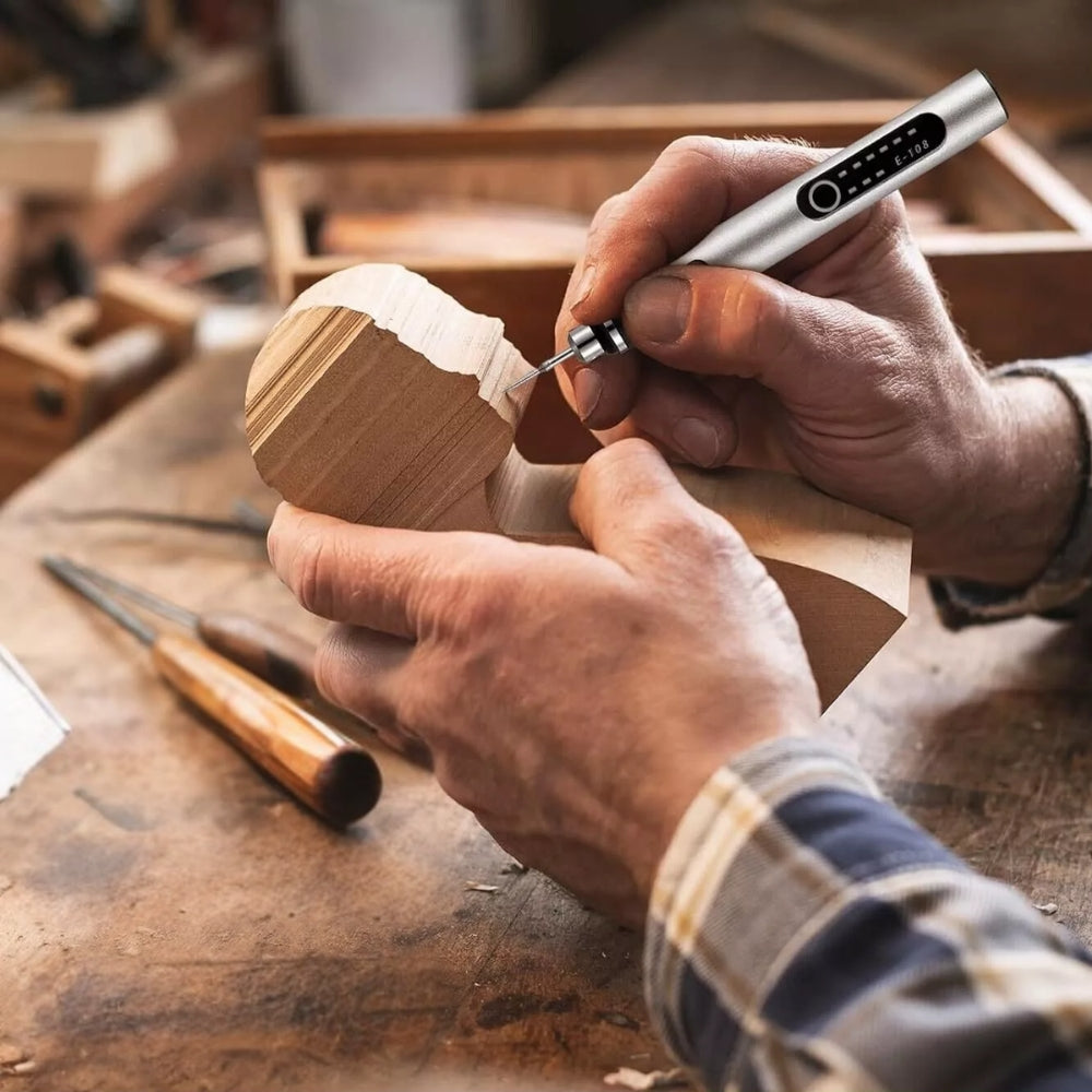 Equipped with a rechargeable 5V lithium battery, the tool is conveniently powered through a compatible USB connector, making charging easy and accessible. It offers three rotation speeds (5000, 10000, and 15000 rpm), adjustable with a single button, to suit different project needs.