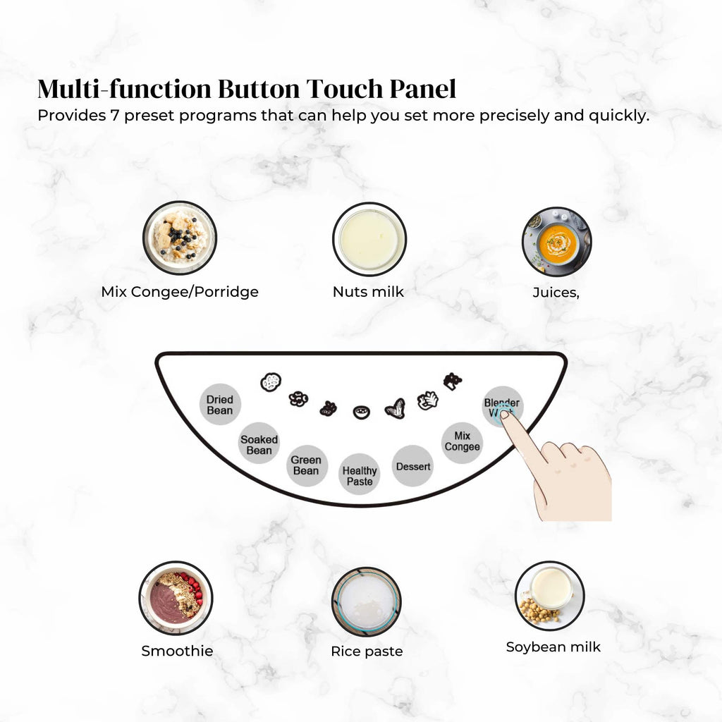 The Soy Milk and Soup Maker is a multifunctional, fully automatic kitchen appliance, with high efficiency bottom heating to save energy.