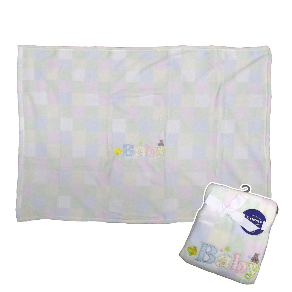 This Embroidery Baby Coral Fleece Blanket Bassinette Size by Elements will add a playful design to your nursery room. It features a comfort, warmth, and stylish design of embroidered ""Baby"" word, teddy bear and a duck on a checkered background. It is made from 100% Polyester for an extra soft touch with white, baby yellow, baby pin, baby green, and baby blue colour toning.