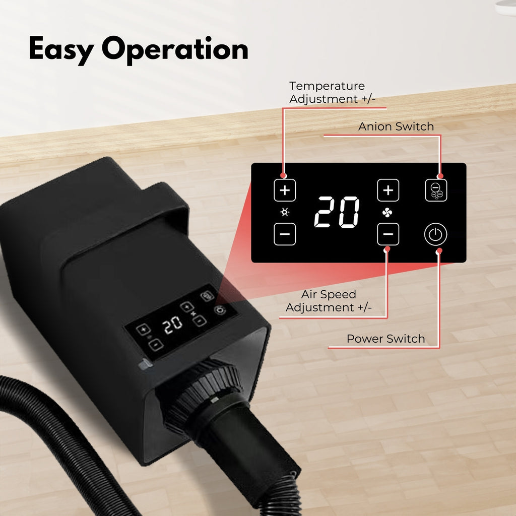 Precise Thermal and Airflow Control: Benefit from precise control over both thermal and airflow settings. This feature allows you to tailor the drying process to your pet's needs, ensuring a safe, effective, and comfortable grooming session.