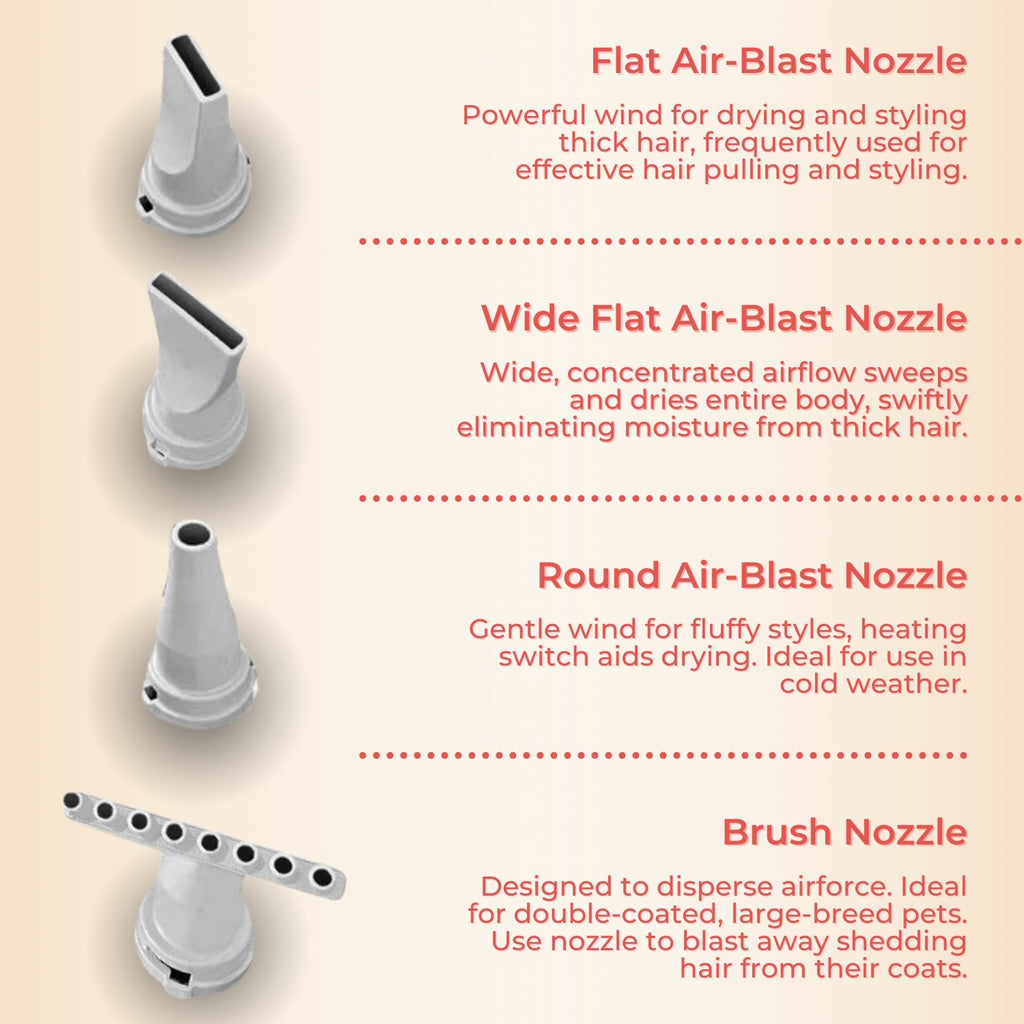 Precise Thermal and Airflow Control: Benefit from precise control over both thermal and airflow settings. This feature allows you to tailor the drying process to your pet's needs, ensuring a safe, effective, and comfortable grooming session.