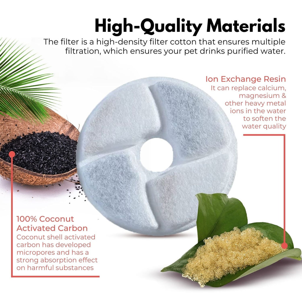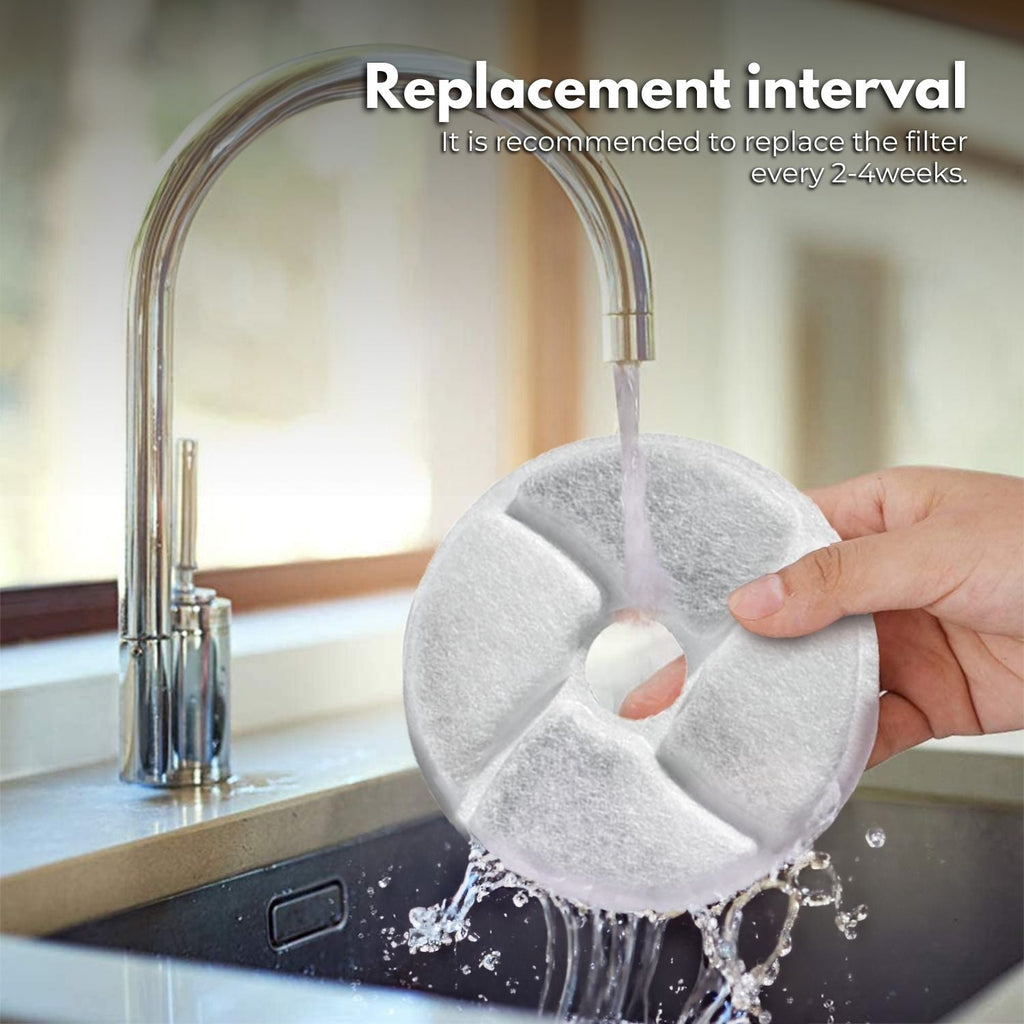 The water fountain for cats is equipped with a single replacement filter and 2 sponge filters. The former is made of PP cotton layer, activated carbon, and Ion exchange resin. Both can remove 99% of impurities: pet hair, sediments, debris, bad odors, and heavy metal. -