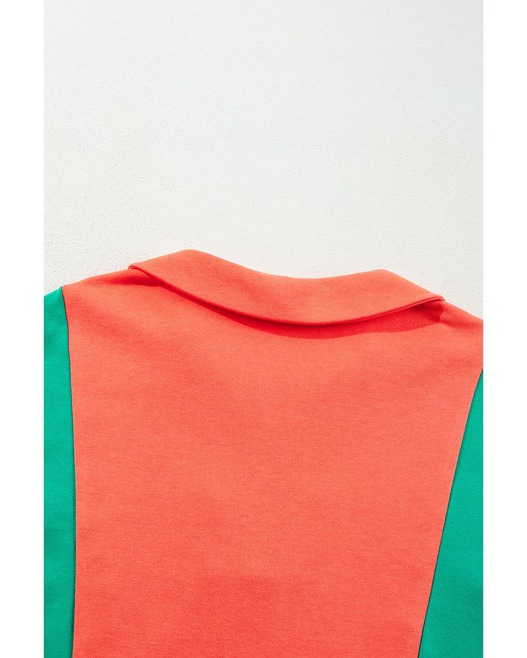 Grapefruit Orange Color Block Patchwork Collared V Neck Loose Top - L