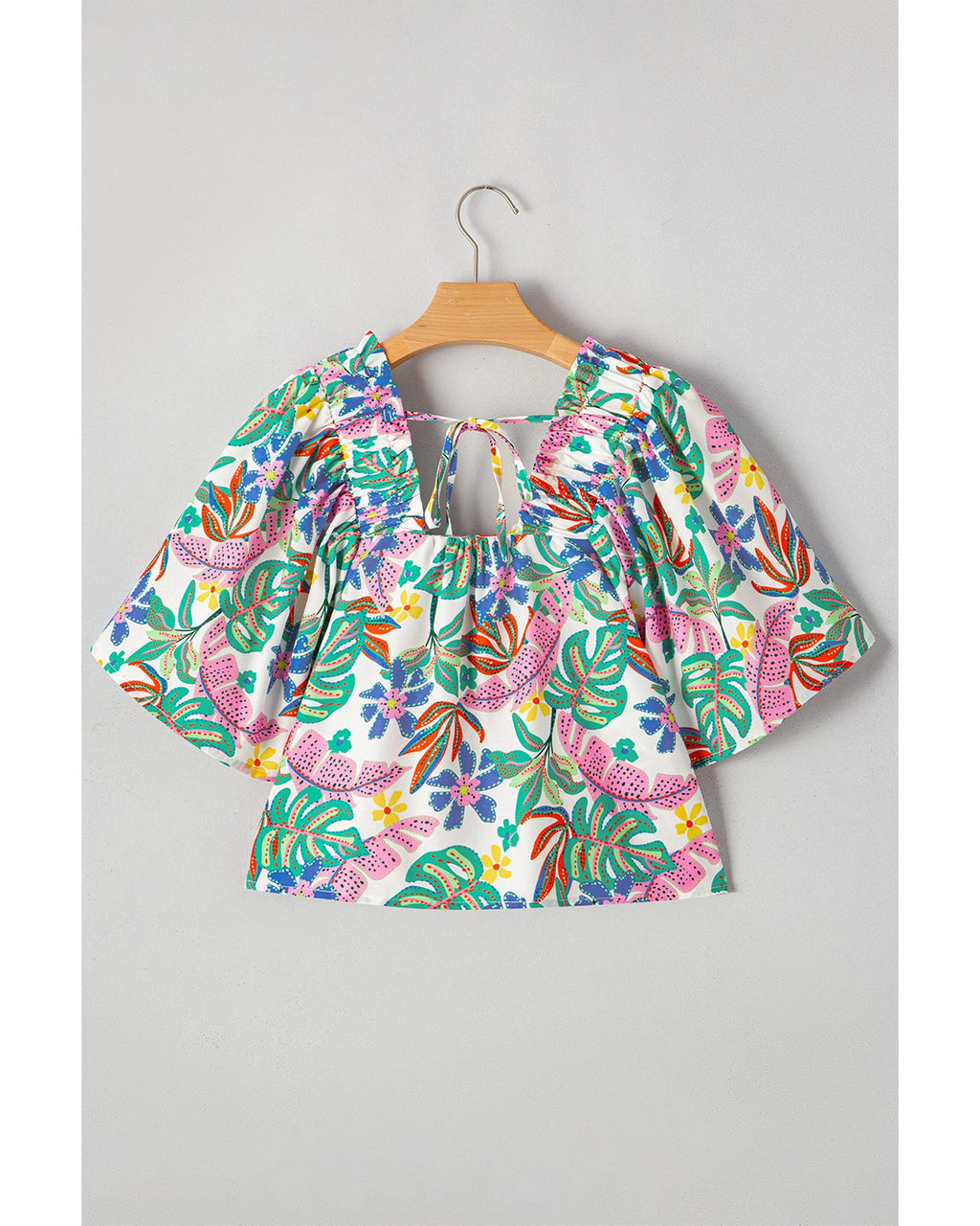 Green Plant Print Loose Fit Puff Sleeve Square Neck Blouse - S