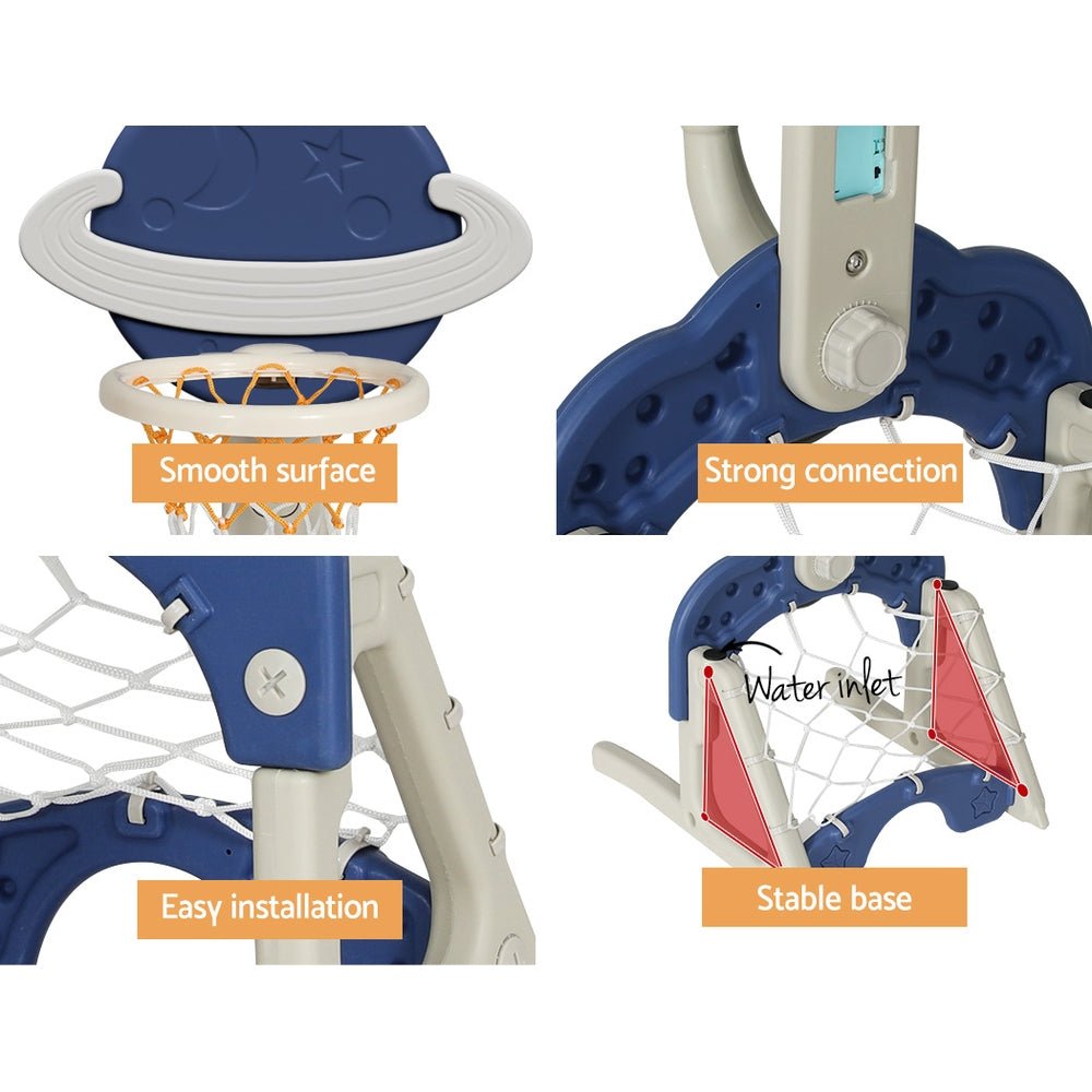 Foster your children's love of sport early with the children's Basketball Hoop Set from Keezi. Made from non-toxic PP material with a smooth surface and stable triangular base, the hoop is safe for children 3-7 years old. The 6-in-1 activity centre is not just for basketball. With a soccer game, ring toss game, golf game and removable music box, your children will be entertained for hours on end. The stand is height adjustable to account for different ages and heights. Add water to the base structure for increased stability. The stand can be used indoors or outdoors, so you can enjoy exercise anywhere, anytime. Easy to assemble and maintain, your kids will love the exciting thrills of the 6-in-1 Basketball Hoop Set from Keezi.