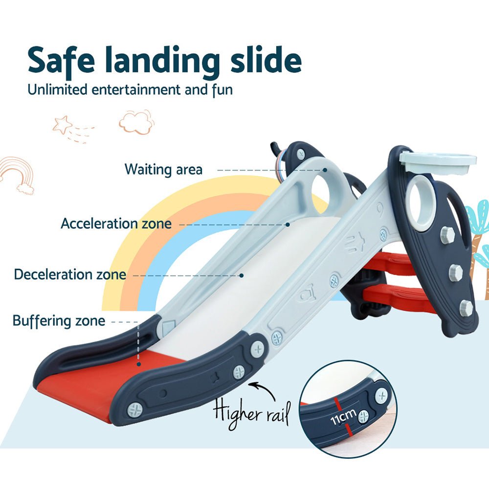 Our Keezi 3-in-1 play set comes with a long slide, ring game, basketball hoop and a bonus ball and pump, giving your child unlimited hours of fun and engaging play. Not just fun, but your kids' concentration skills will also improve with basketball and ring game. Crafted from durable, high-density non-toxic material, this fun-filled slide set has a triangle force structure that prevents tilting. Plus, the non-slip gasket design increases child safety and improves overall stability. Additionally, it has wide, gapless steps, smooth rounded edges, firm-grip handles, and a safe landing slide, ensuring your child's safety while playing. What's most exciting about this play set is its foldable design that frees up your space. So fold it when not in use. You can also use this play set both indoors and outdoors.
