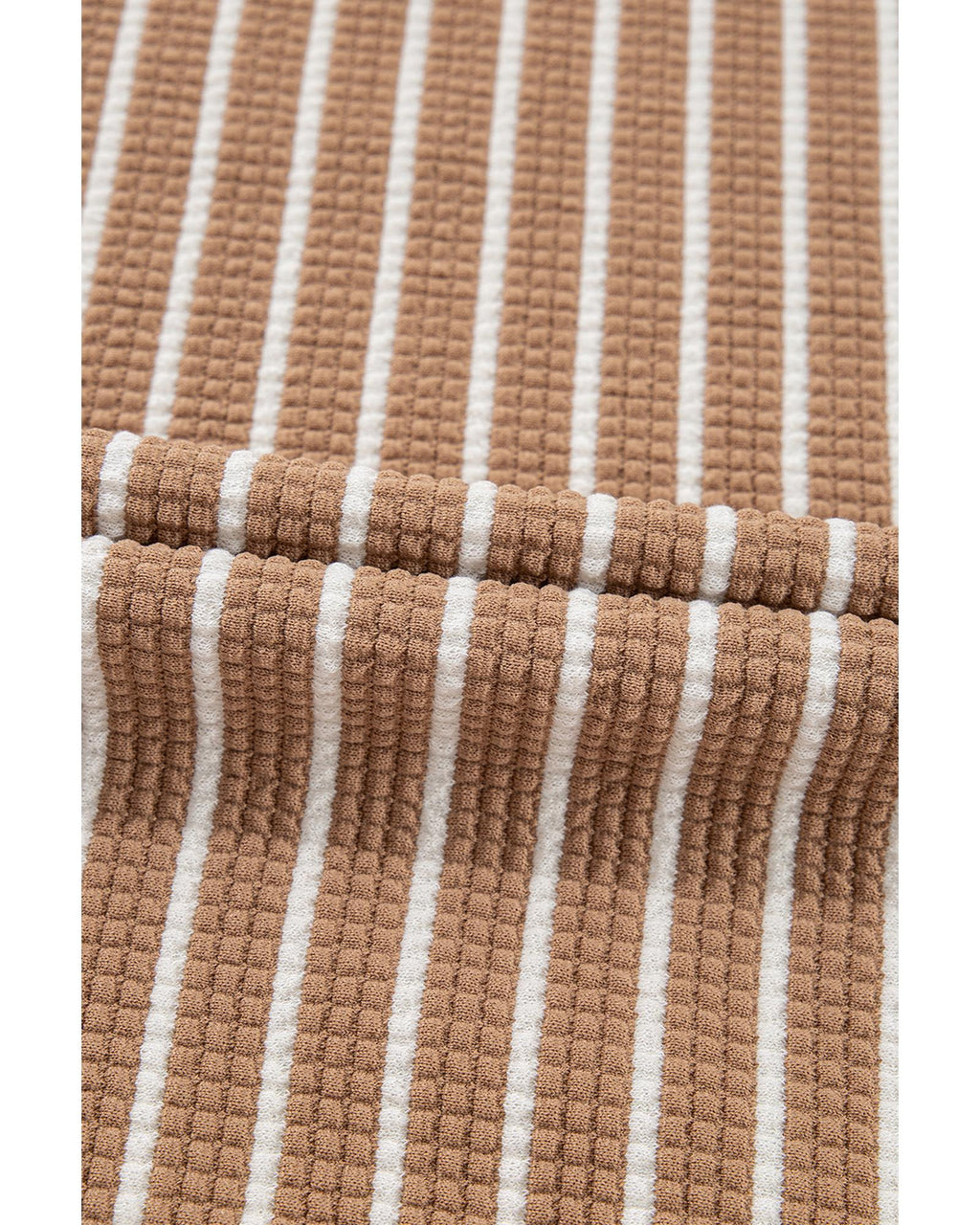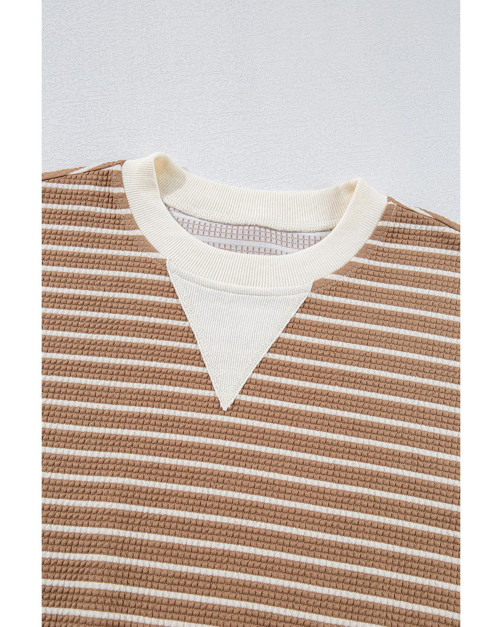 Khaki Stripe Patched Edge Textured Round Neck Long Sleeve Top - XL
