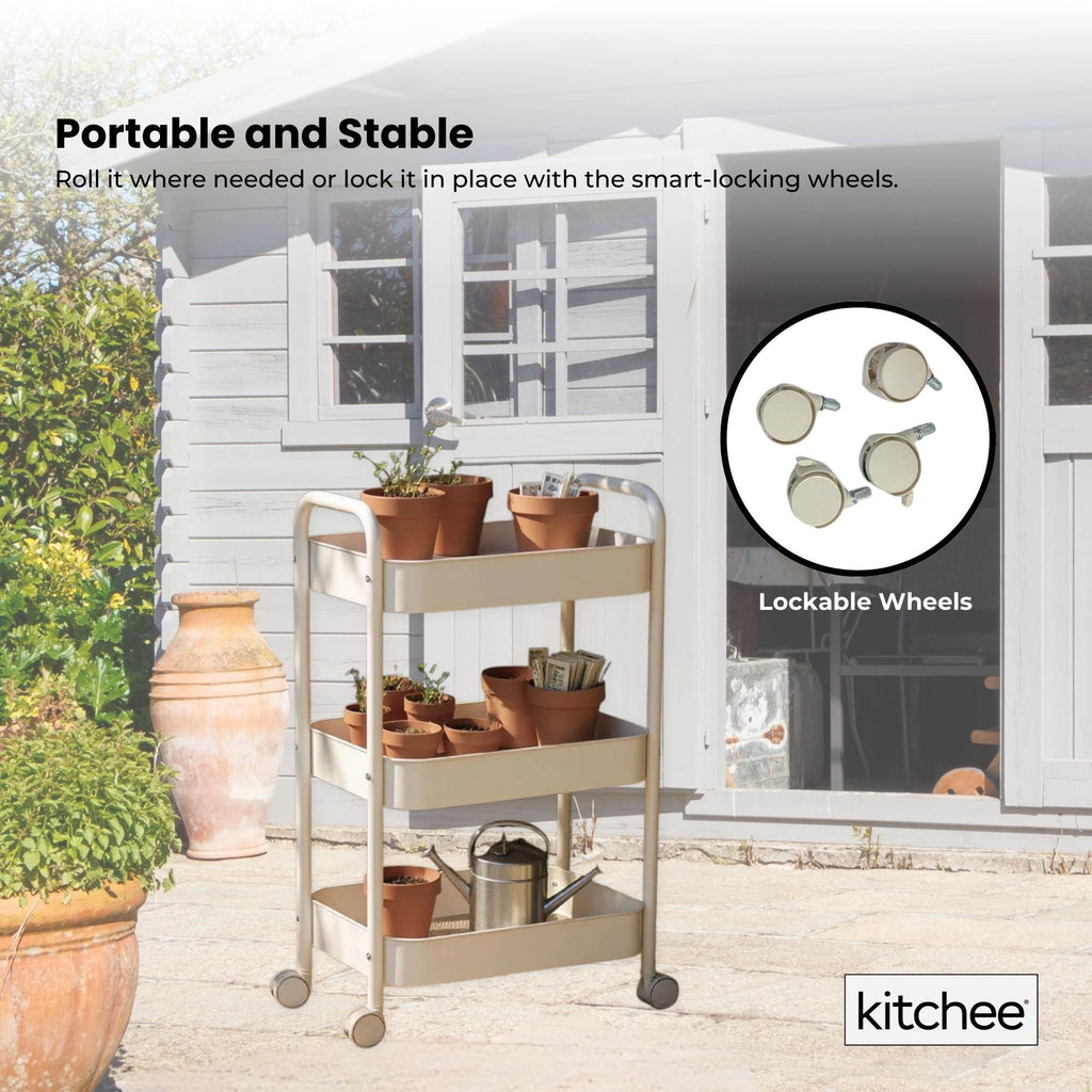 Kitchee 3-Tier Kitchen Storage Cart with Lockable Wheels will keep your home or office organised with this versatile rolling storage trolley. Featuring durable metal mesh moulded shelves, smooth-rolling caster wheels, and a lightweight steel frame, it’s ideal for use in the kitchen, bathroom, bedroom, office, or anywhere you need extra storage.