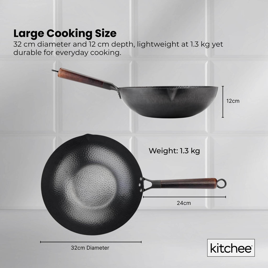 The Kitchee 32 cm flat-bottom hammered carbon steel wok is crafted using traditional forging techniques, where the silver-white iron is heated at high temperatures until it develops a durable blue-black finish.