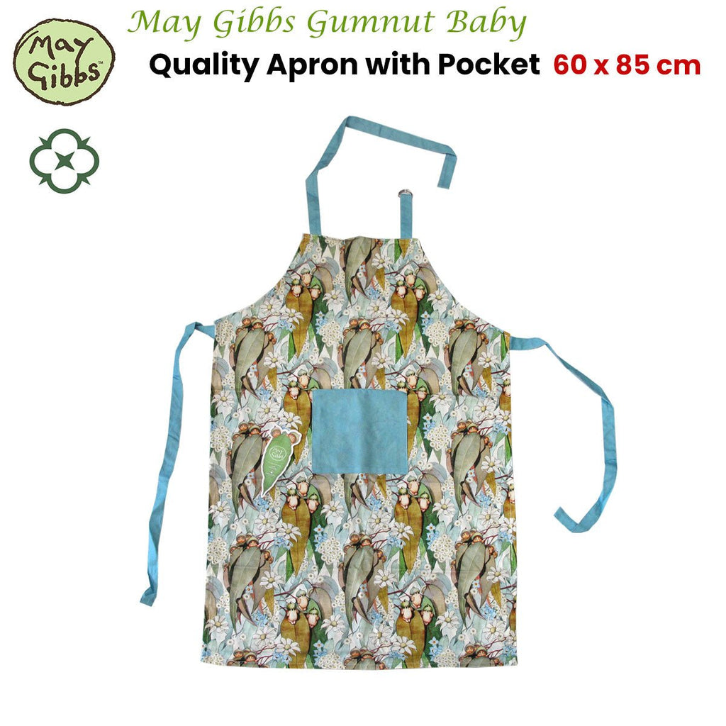 Whip up delicious meals in style with this adorable May Gibbs Gumnut Baby Cotton Apron 60 x 85 cm! Pocket size 18cm wide x 16cm height. Made from soft, quality cotton, this apron is comfy to wear and keeps you protected from spills. Featuring a whimsical design of May Gibbs' Gumnut Babies surrounded by pretty flowers and leaves in cream, blue, green, black, white, brown, yellow, and grey colour hues, this apron is sure to brighten up any kitchen!