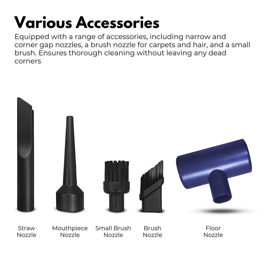 - Various Accessories: Equipped with a range of accessories, including narrow and corner gap nozzles, a brush nozzle for carpets and hair, and a small brush. Ensures thorough cleaning without leaving any dead corners.