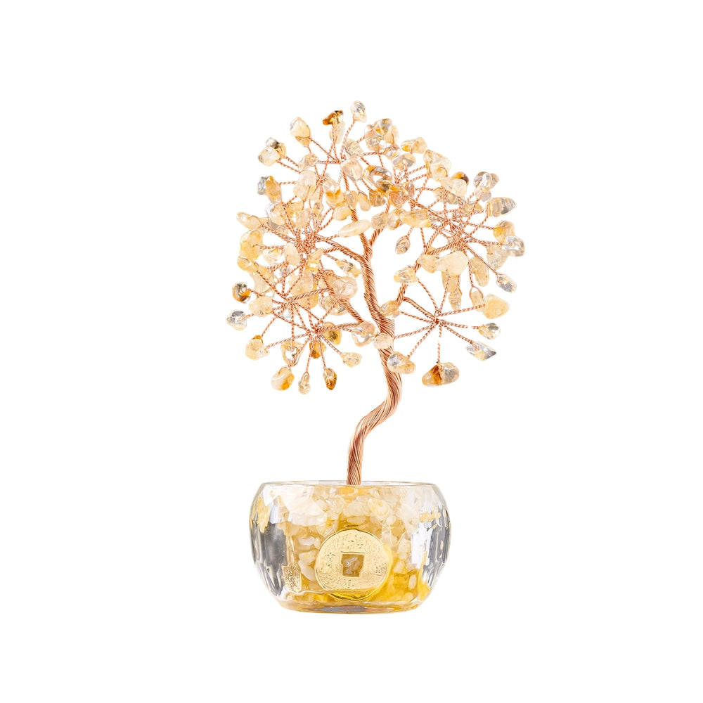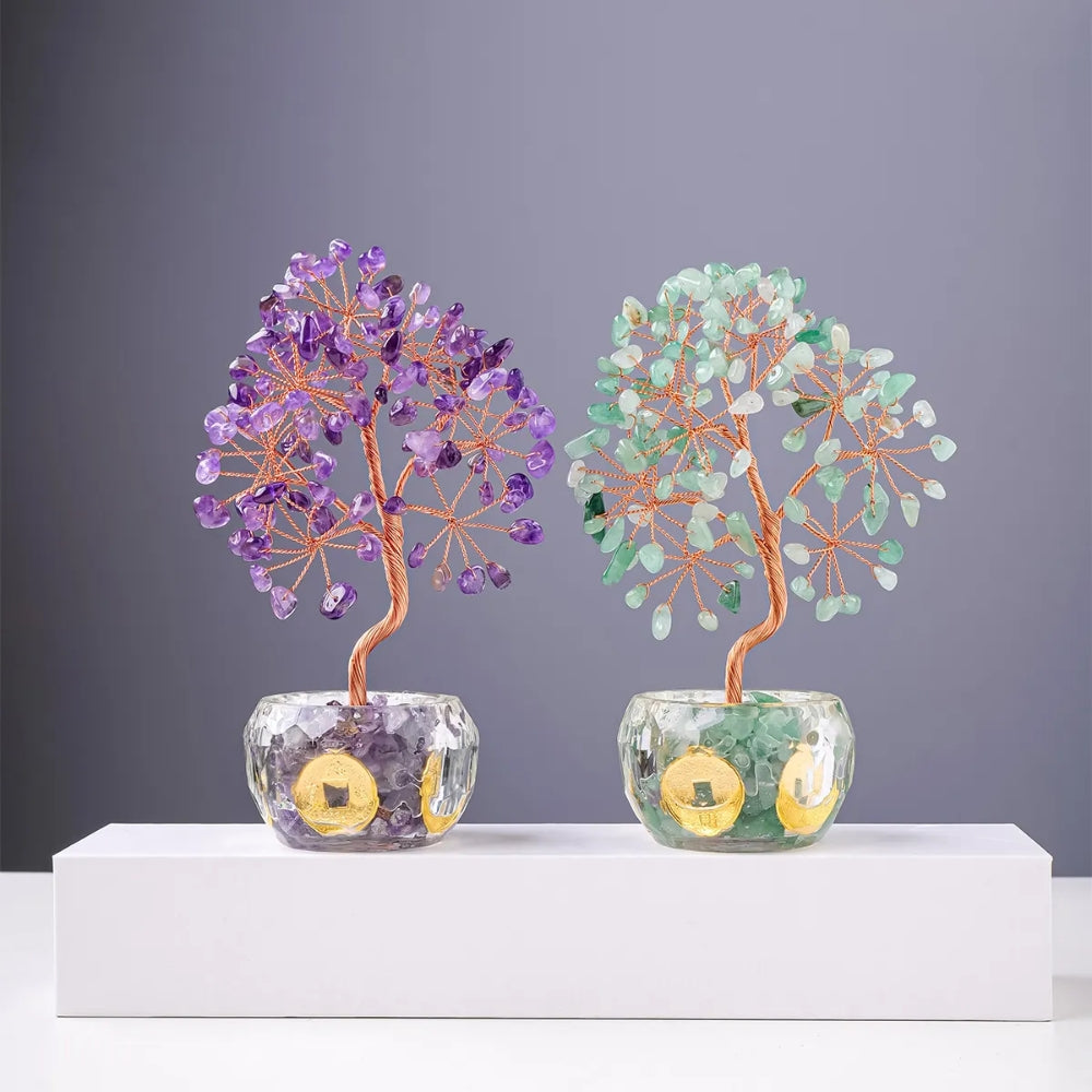 The Mini Natural Crystal Fortune Tree is a beautiful and unique decoration crafted from natural crystal gravel, agate pieces, and copper wire. Its stunning design combines the natural beauty of gemstones with intricate craftsmanship, making it a perfect piece for any home or office. Each tree is a one-of-a-kind creation, featuring a natural agate slice base that varies slightly in size, color, and shape, adding to its charm and uniqueness.