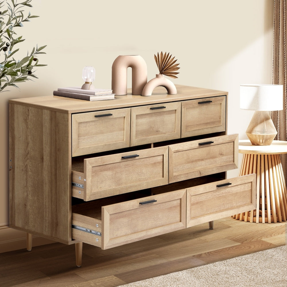 Seven drawers, including three small and four large, offer generous storage for clothes and household items. Sleek black aluminium handles and smooth metal runners ensure easy opening and closing. The top surface provides extra display space.