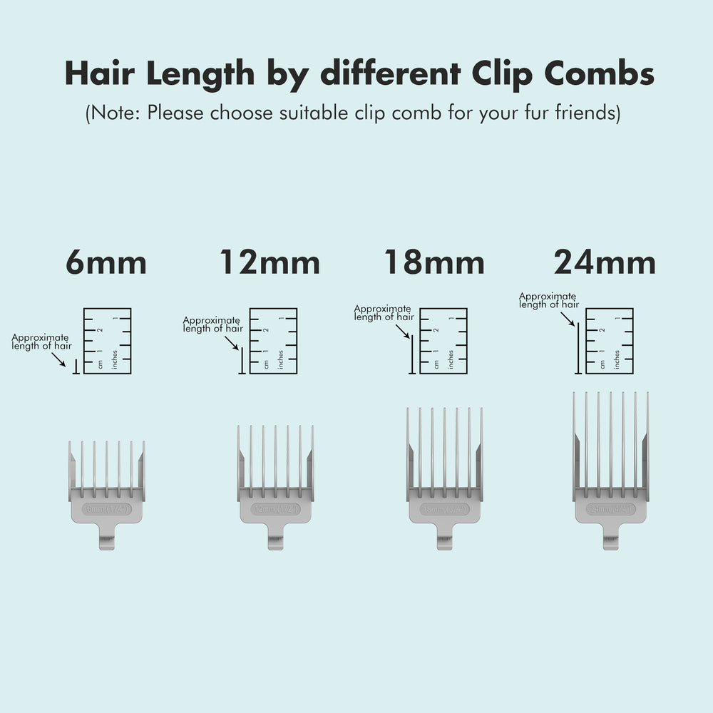 4 Comfort Guard Combs: The adjustable clipping comb(6mm/12mm/18mm/24mm) is applicable for clipping hair of different lengths. The detachable guide combs are made for quick, easy comb changes and increased versatility.