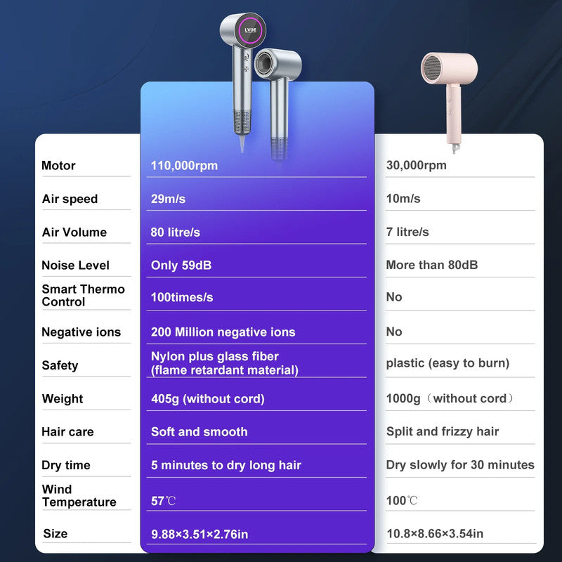 - High-Speed Brushless Motor: 110,000 RPM for fast and efficient drying.