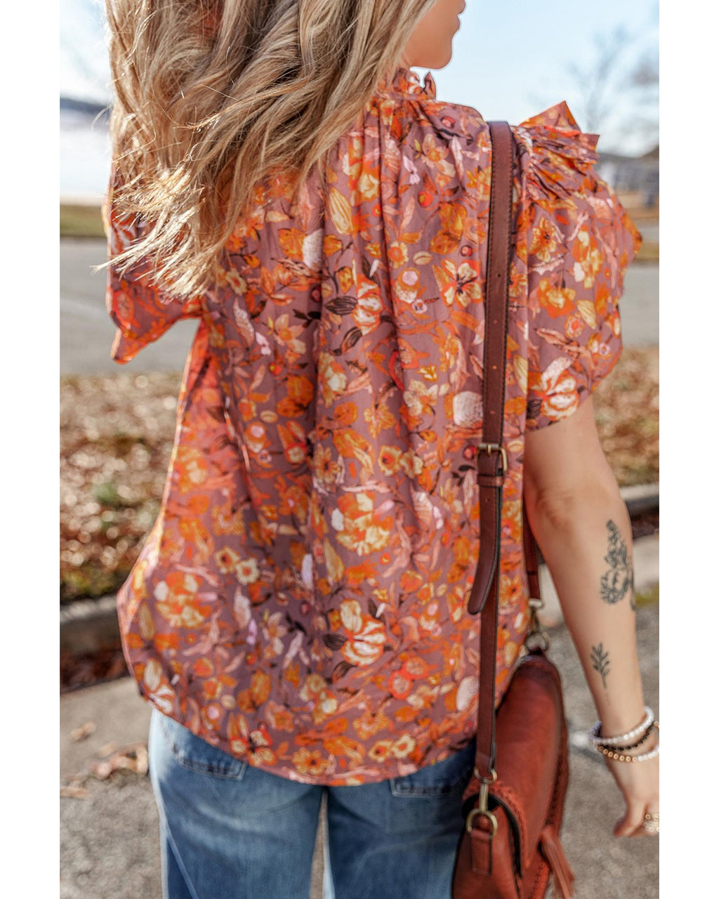 Orange Floral Print Ruffled Flutter Sleeve Frilled V Neck Blouse - L