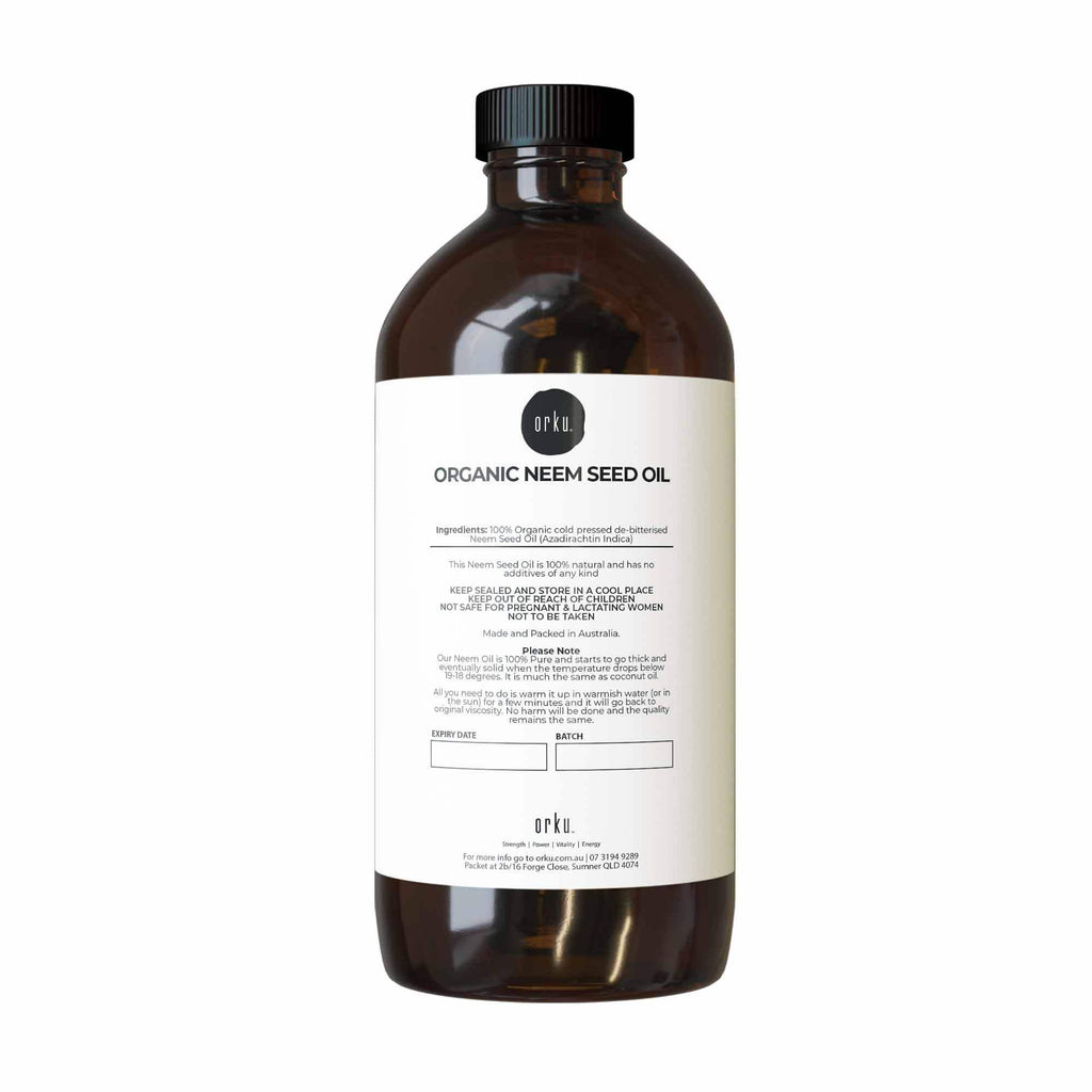 Organic Neem Seed Oil in Amber glass (round) bottle.