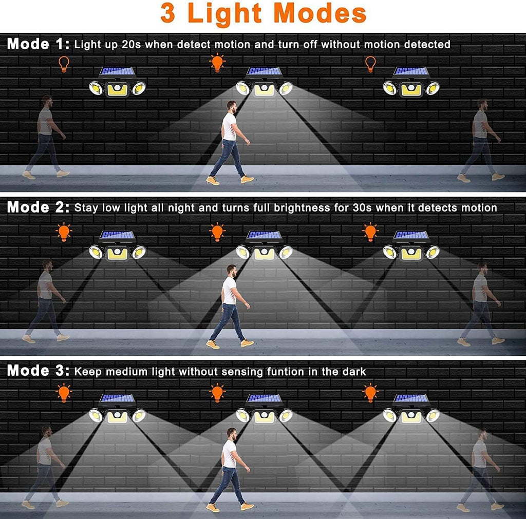 - Motion Sensor Light with Three Modes: Solar Light Outdoor is equipped with wide angle and a sensitive motion sensor, which can provide illumination widely and without delay. (Sensor mode: Light up 20s when detects motion and turn off without motion detected. Low light sensor mode: Stay low light all night and turns full brightness for 30s when it detects motion. No sensor mode: Always lights at 50% luminosity. ) Motion sensor distance: 3-6 meters.