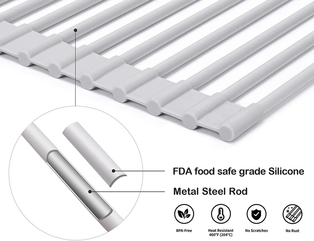 - Resistant to rust, non-slip, durable, glassware friendly, and sturdier than stainless steel racks. Oil-resistant, very easy to clean. Collapsible, and rolls up for easy storage. Welcome to compare.