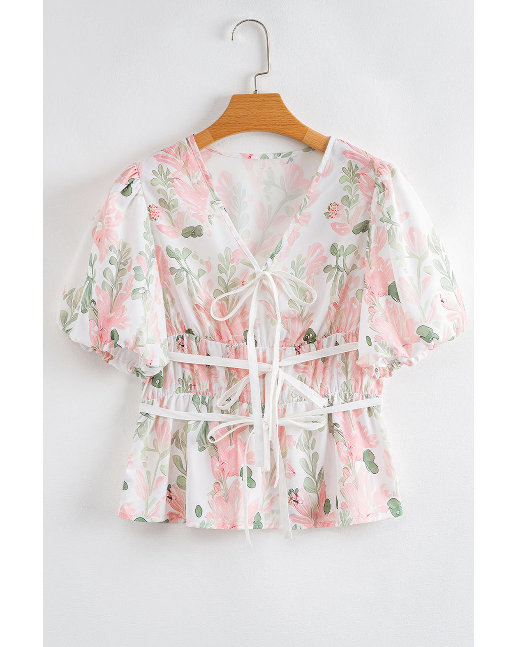 Pink Floral Puff Sleeve V Neck Tied Front Peplum Blouse - M