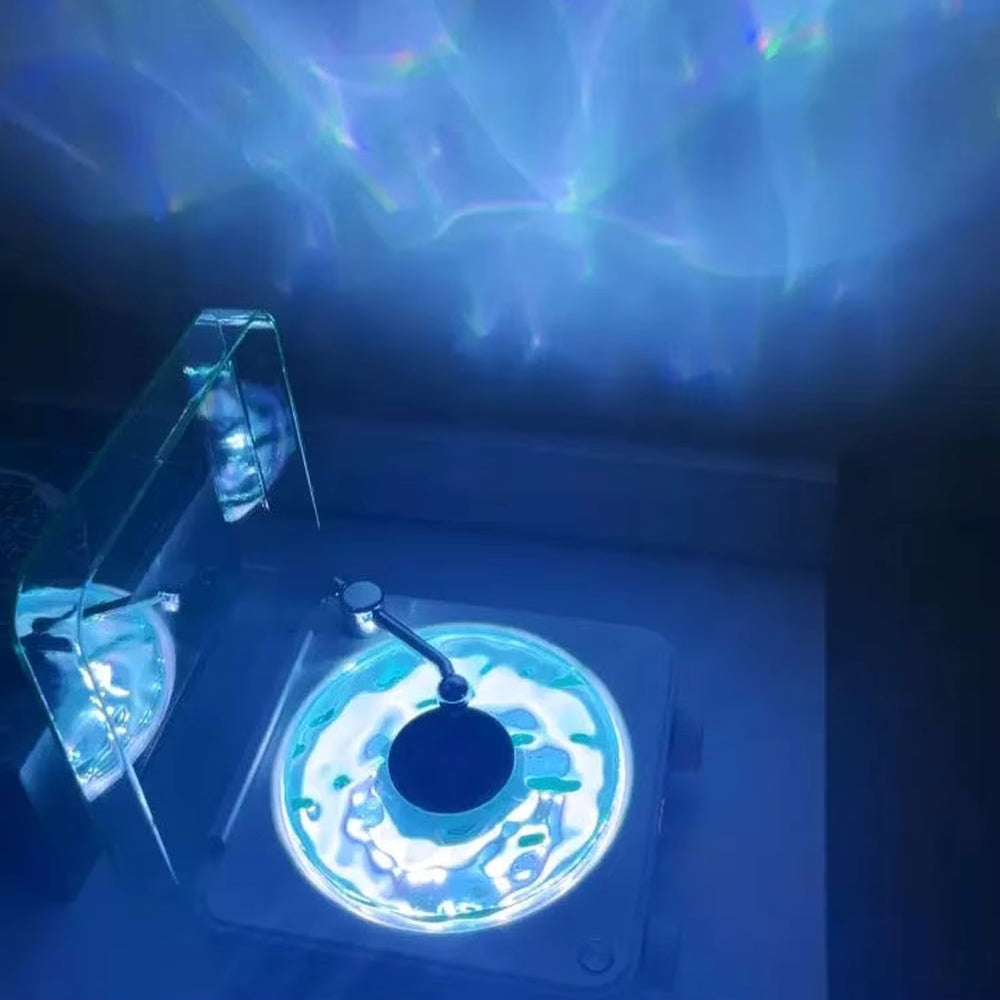 A unique breathing light feature enhances the speaker's design. The transparent water ripple turntable rotates with the music, creating a calming visual effect. The screen-off design prevents sleep disruption, while the screen can be easily activated by tapping the speaker or vibrating the surface it rests on. This speaker is designed for various settings and occasions.