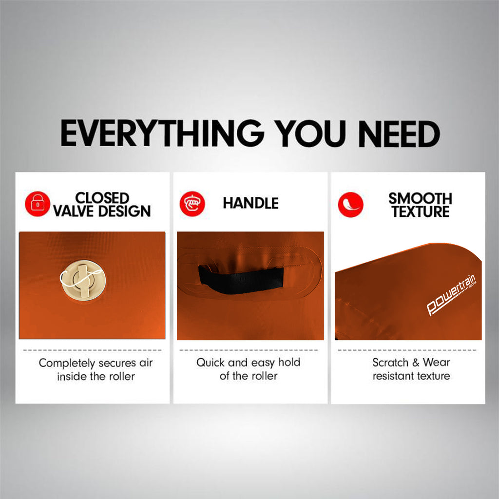 Improve your strength, balance, and coordination with Powertrain's inflatable air barrel. This orange air barrel is designed to help gymnasts learn front flips and backflips safely, with a wide surface to provide gentle cushioning and support.