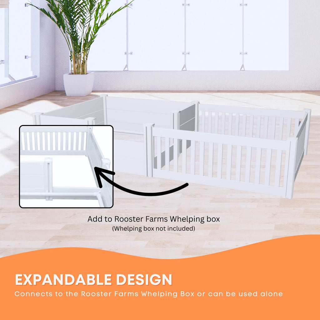 Expand your whelping setup with this Rooster Farms Attachable PVC Playpen, designed to provide extra safe space for puppies once they begin exploring. Built from durable, non-porous PVC, it is easy to clean, lightweight, and strong enough for daily use. The modular design allows it to connect seamlessly with the Rooster Farms PVC Whelping Box.