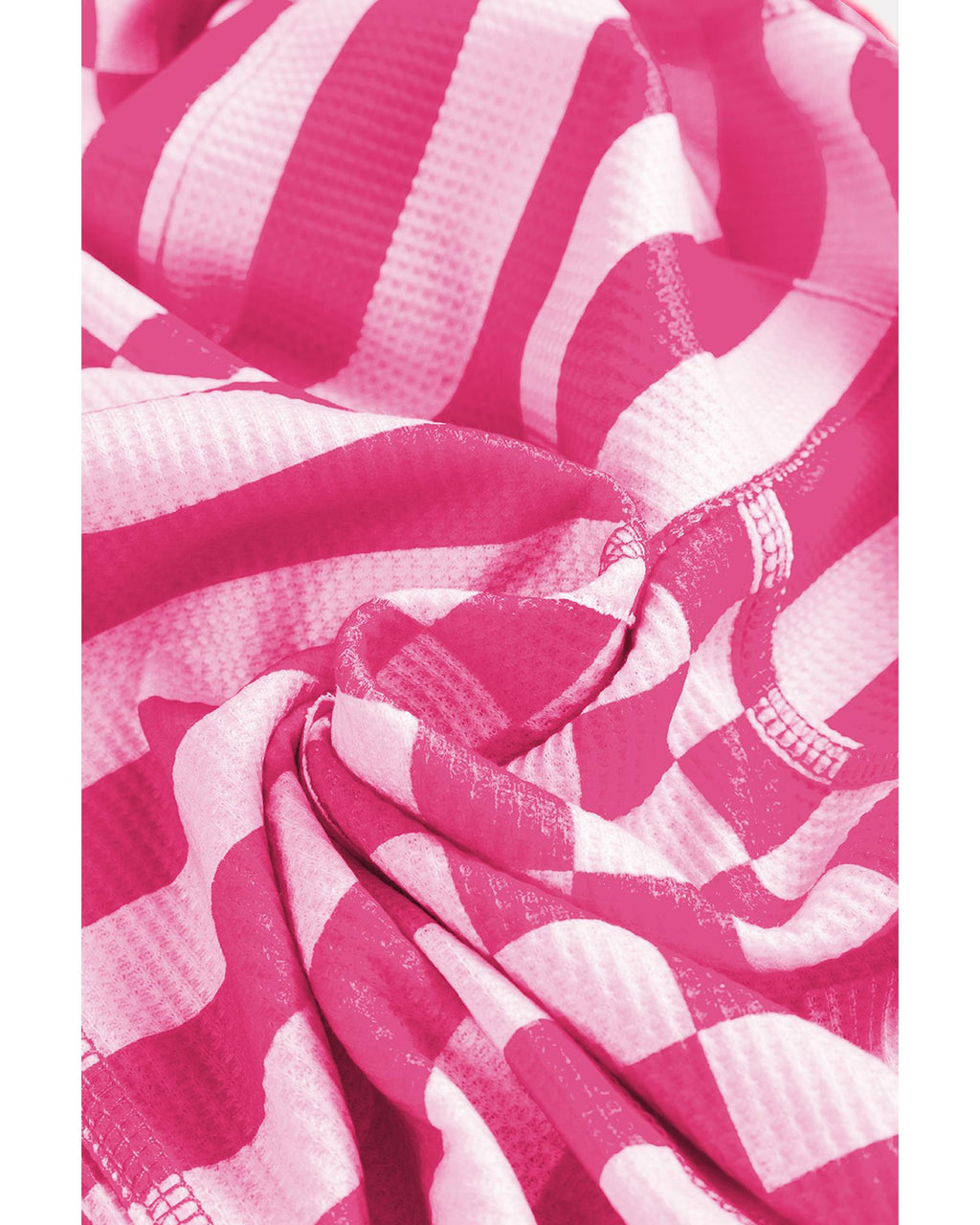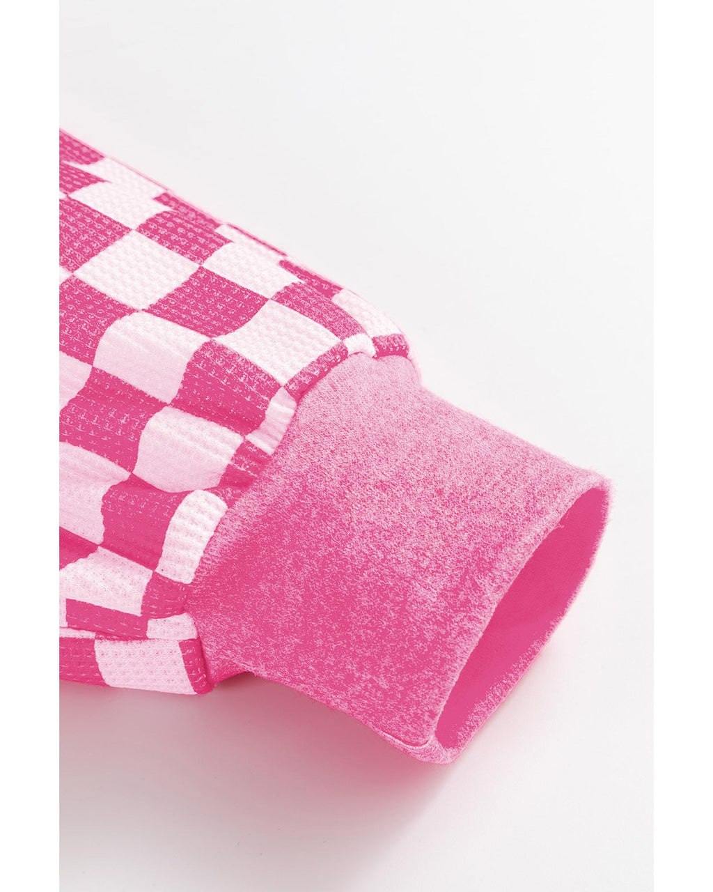 Rose Red Checkerboard Striped Patchwork Lantern Sleeve Pocketed Blouse - L