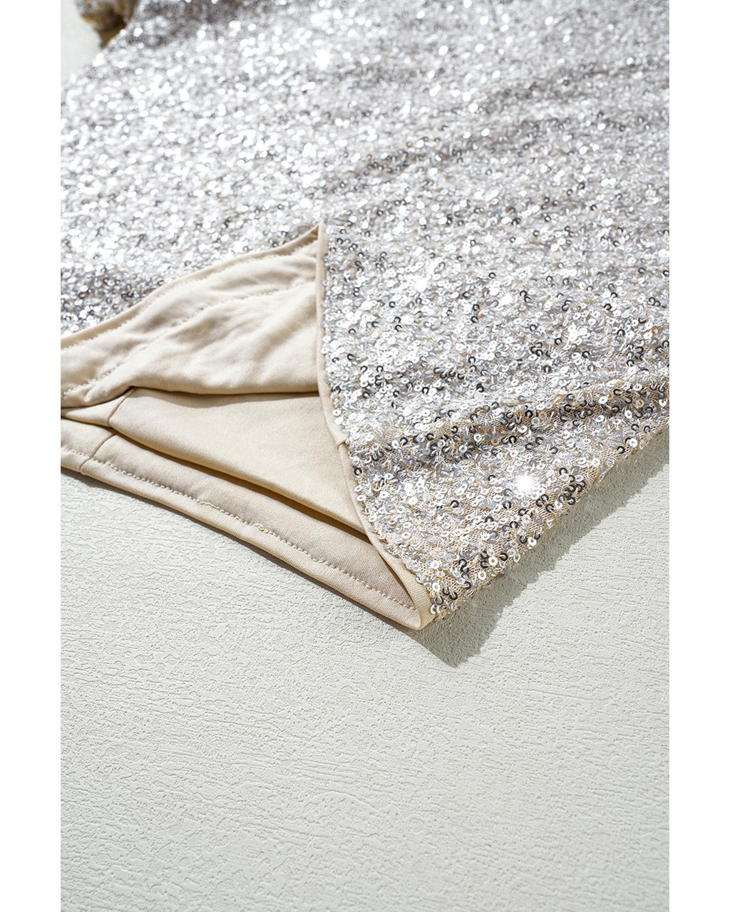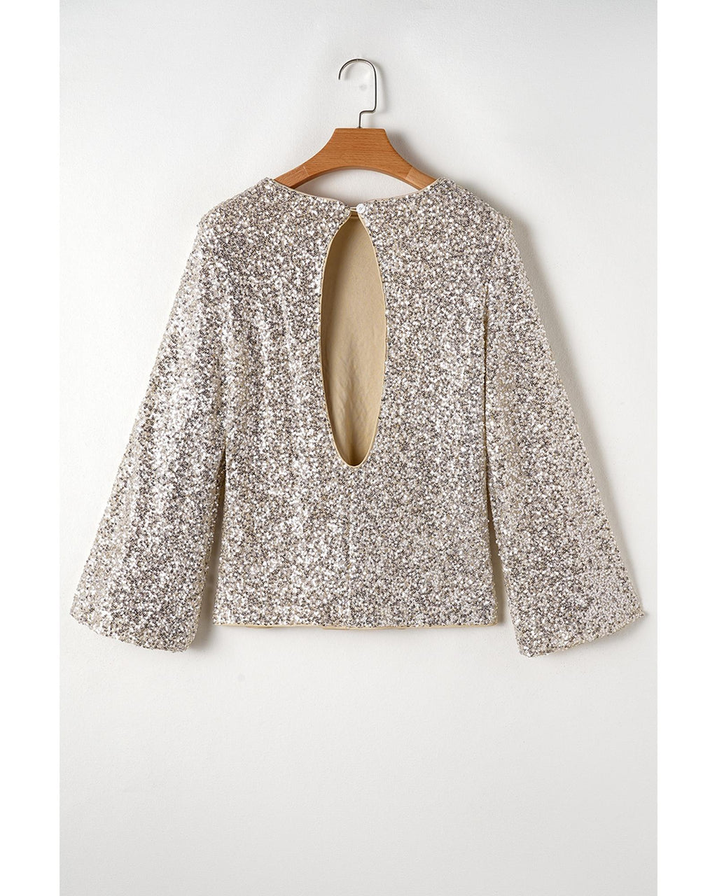 Silvery Sequin Puff Sleeve Cutout Back Blouse - XL