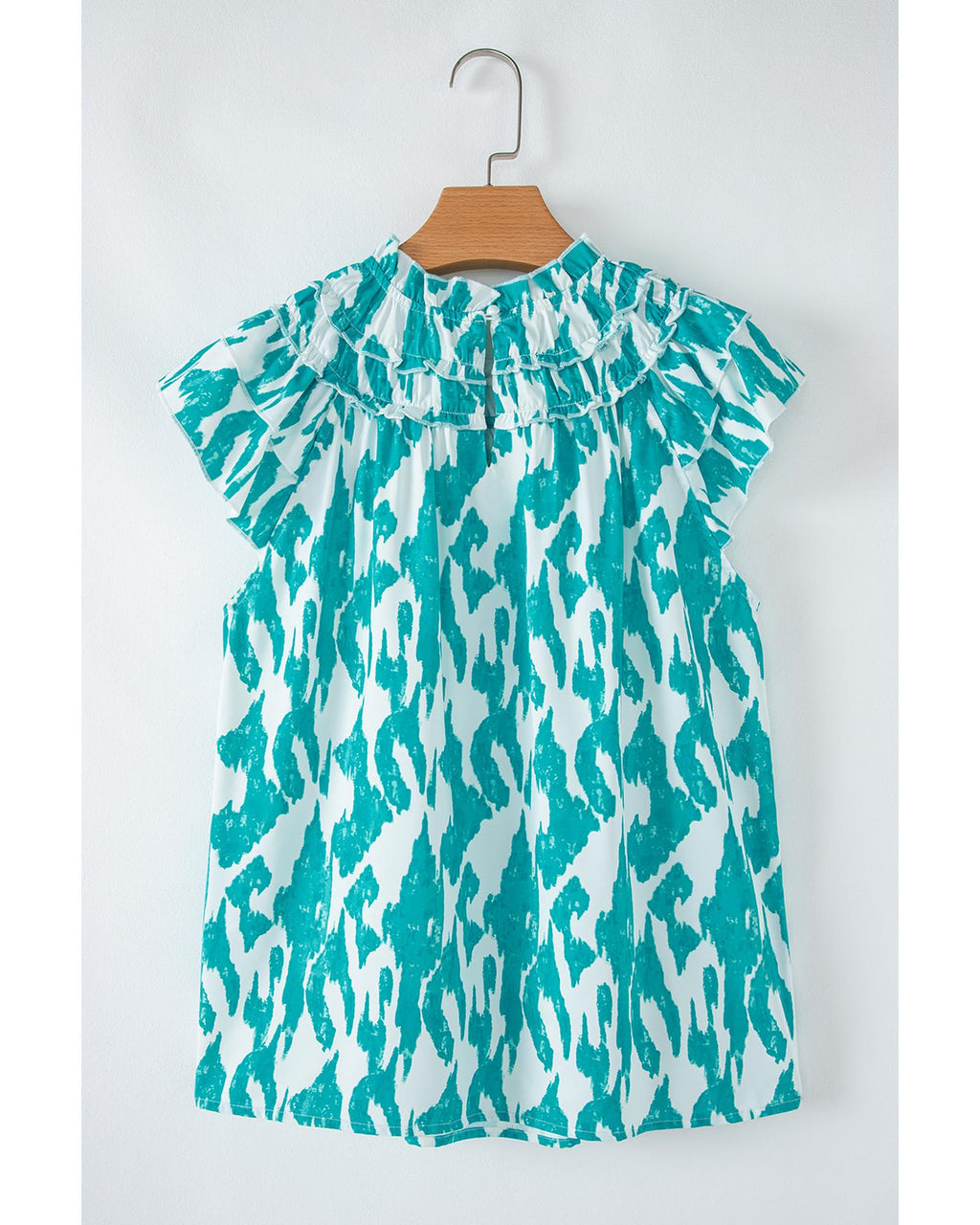 Sky Blue Abstract Print Frilled Crewneck Loose Fit Blouse - S