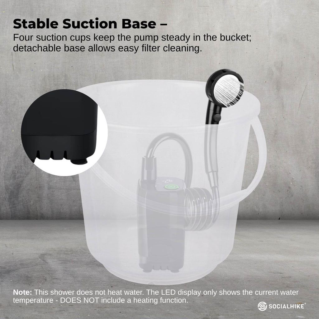 - Stable Suction Base - Four suction cups keep the pump steady in the bucket; detachable base allows easy filter cleaning.