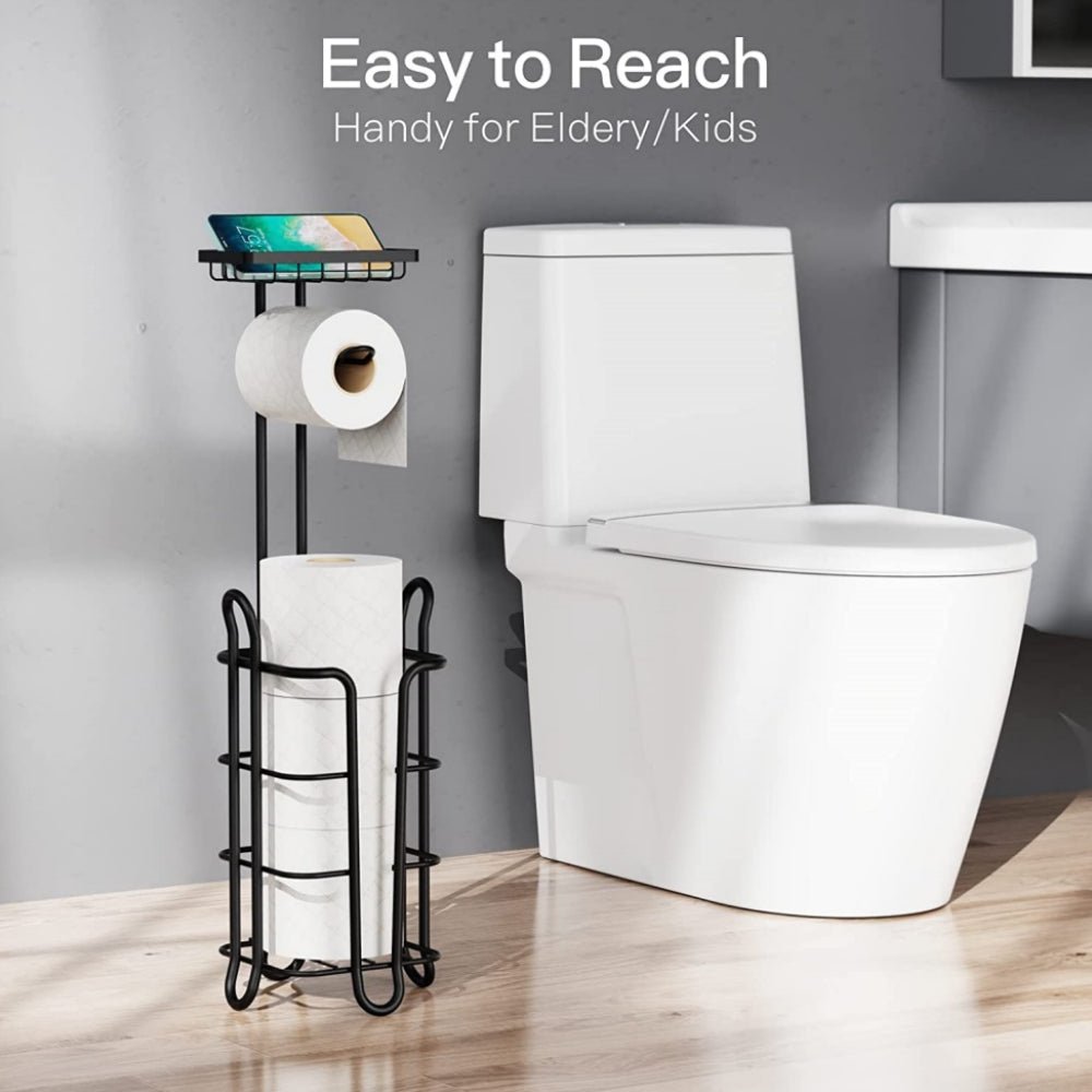 In addition to its primary function, this toilet paper holder stand comes with an added convenience—a cell phone holder on top. The top storage shelf is perfect for keeping your phone, wallet, books, wipes, and facial tissues easily accessible. You can place your mobile phone on the storage rack and enjoy watching TV programs or browsing the internet to make the time spent in the bathroom more enjoyable.